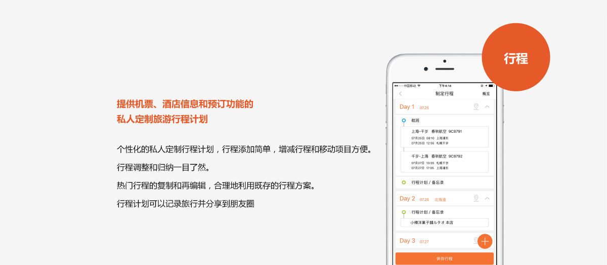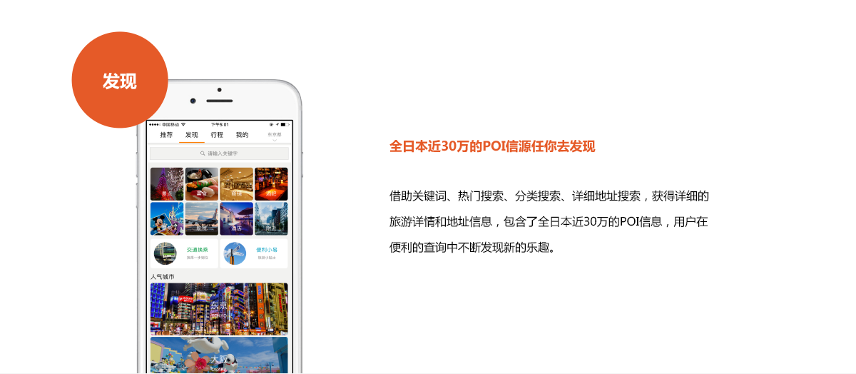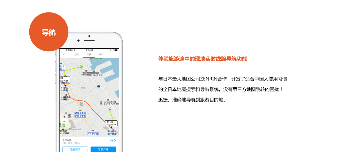 旅行前推荐日本的风光奇景、风俗文化、美食美饮等资讯轻松获得店铺优惠信息和预售门票信息 想去的景点、美食、酒店等,一键轻松添加到计划行程中 了解景点到位置信息,轻松跳转到地图确认 旅行中快速检索日本观光POI信息推介日本观光线路,导航地图中文(语音)显示 使用支付宝购买各种门票 与同时开发的EC商城对接,旅行中的购物以及回国后的网购 与日本快递公司合作,购买的商品配送到酒店或机场 旅行后推荐日本的风光奇景、风俗文化、美食美饮等资讯轻松获得店铺优惠信息和预售门票信息 想去的景点、美食、酒店等,一键轻松添加到计划行程中 了解景点到位置信息,轻松跳转到地图确认 |